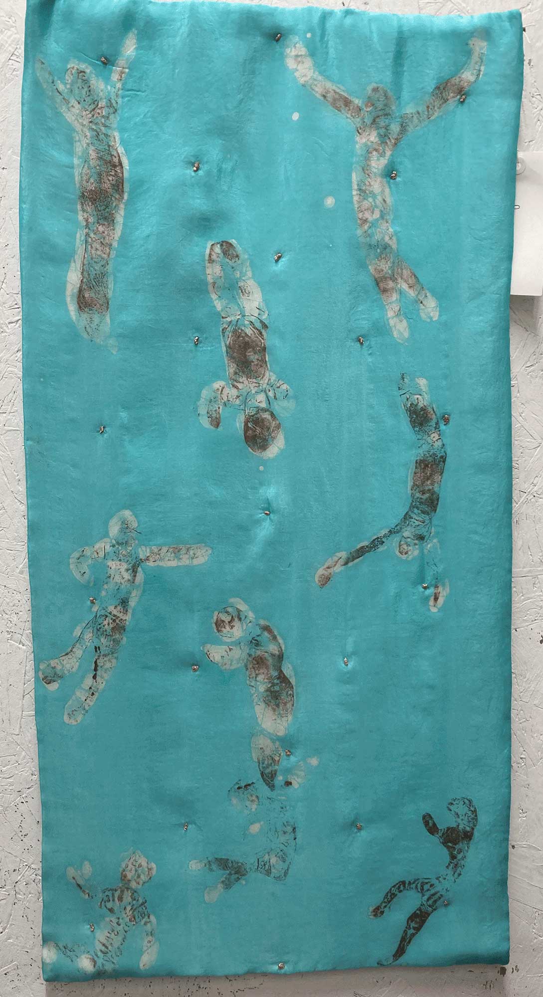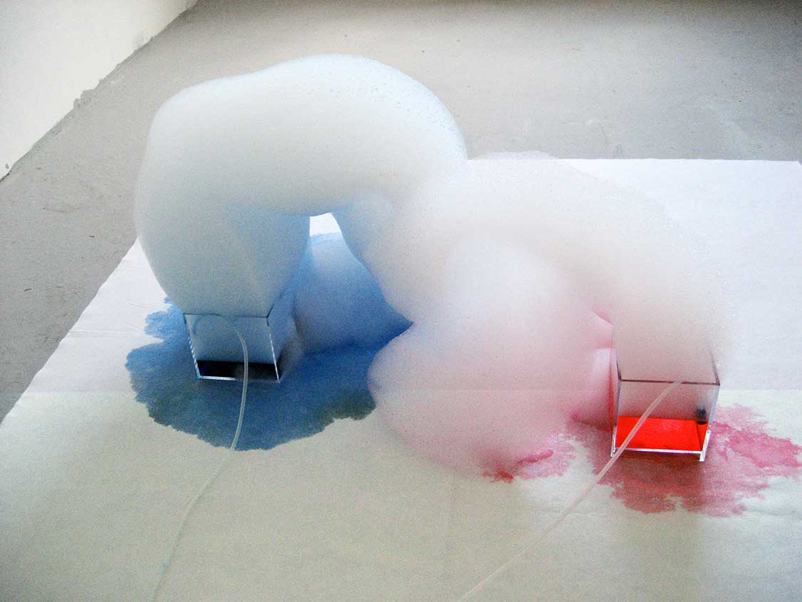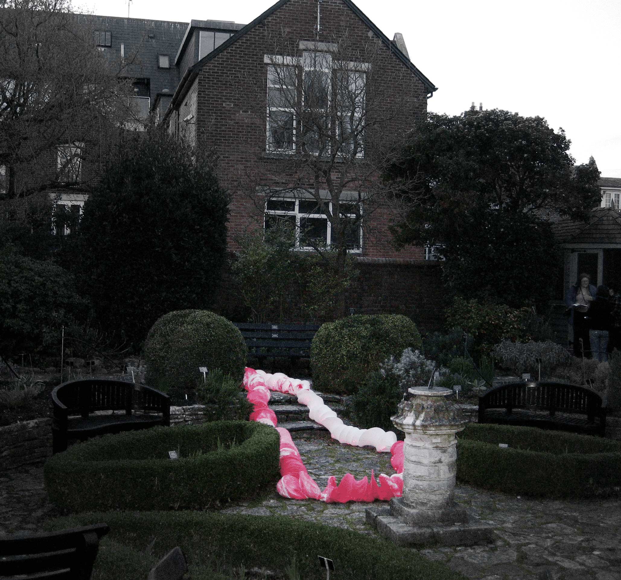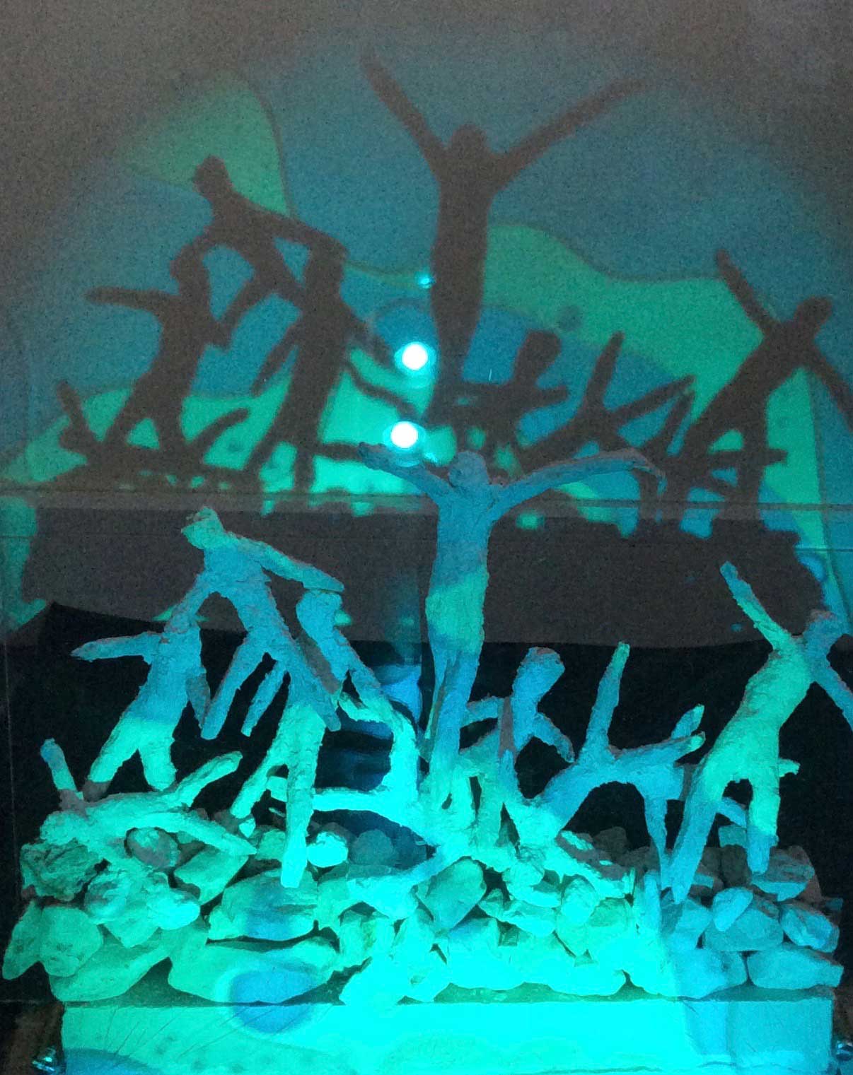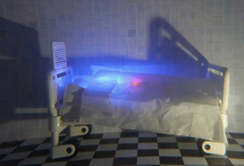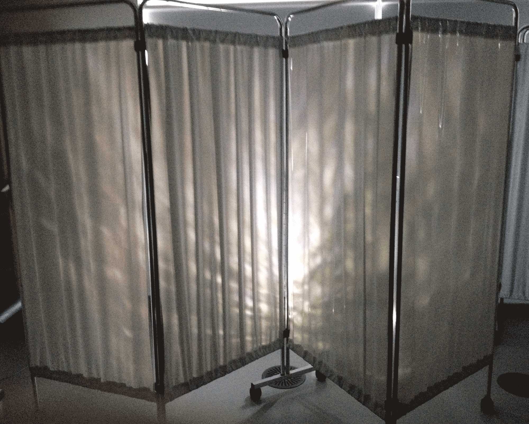 The ‘Screen’ installation is a live back projection onto a clinical white bed screen of abstract black and white images from an underwater CCTV camera in a tank with water fountain and lights with background noise of running water. The viewer can walk all around to explore.
